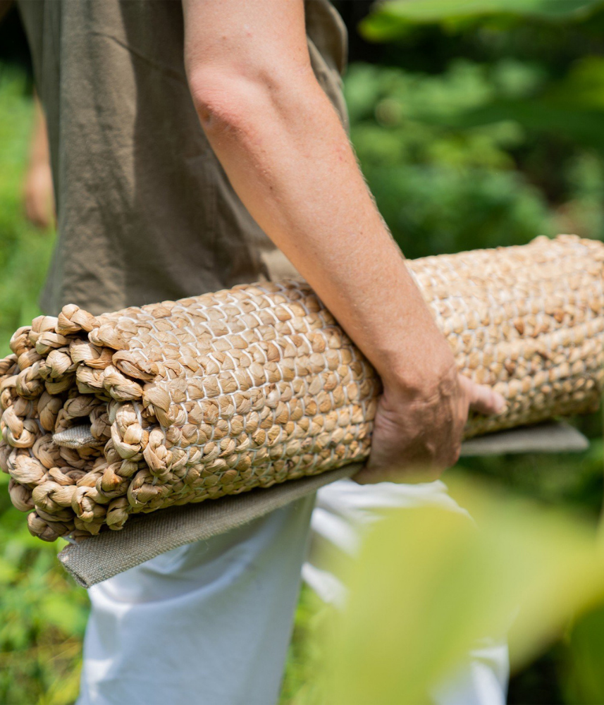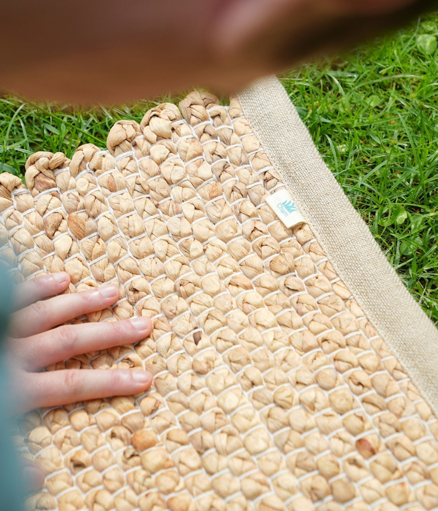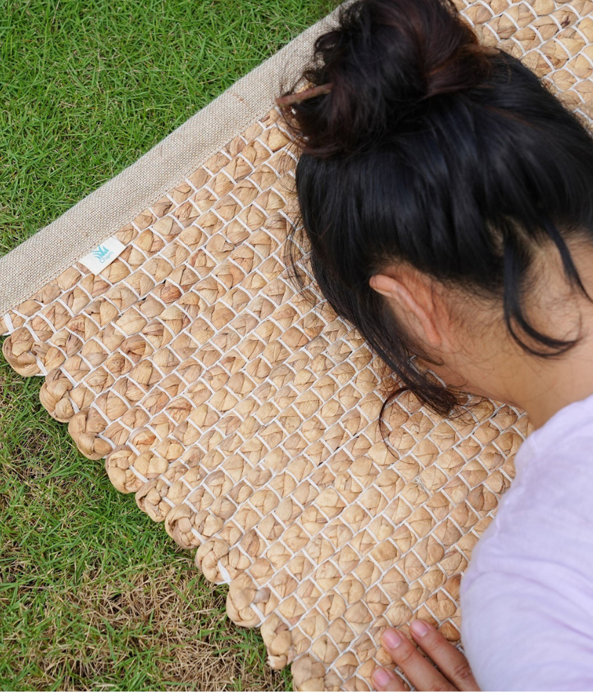 Thảm Tapas được làm từ 100% thân cây lục bình, hoàn toàn tự nhiên. Mỗi cái Chạm trên thảm Tapas như đang bước chân trần trên cỏ; cái cảm giác kết nối trực tiếp với Mẹ Thiên Nhiên.